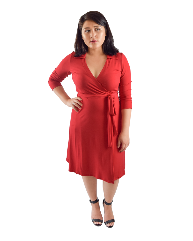 This A-Line, red wrap dress with 3/4 sleeves and collar is one of our signature dresses and provides a traditional wrap dress silhouette. Perfect for the upcoming festive season!