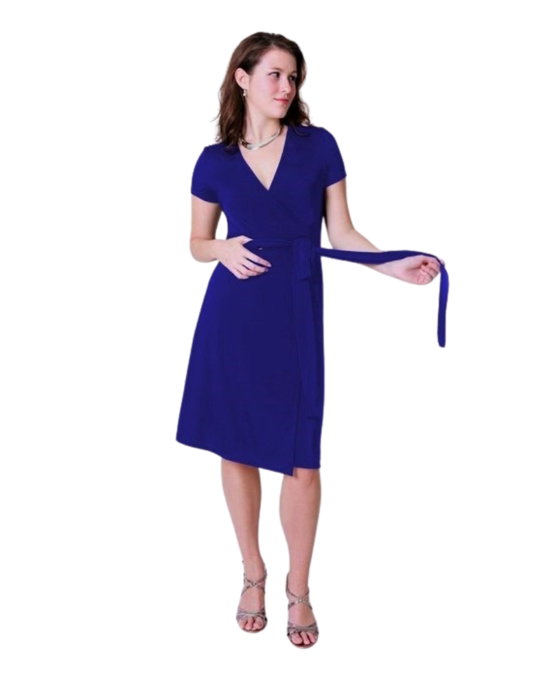 This A-Line, deep-royal blue wrap dress, is one of our signature dresses and provides a traditional wrap dress silhouette. Perfect for the upcoming festive season!