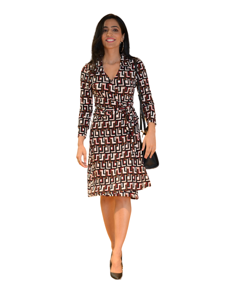 Our A-Line style provides a more traditional wrap dress silhouette. This brown geometric pattern is a new print and is an artistic spin on traditional geometric prints. It has a very slimming effect. Wear it to work as a total Boss Babe, or out to brunch on the weekend.