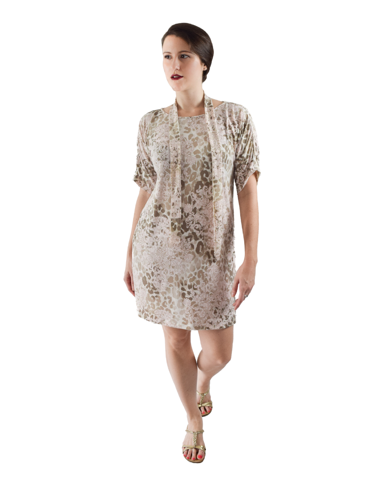 Our Button Sleeve dresses have adjustable sleeves which can be worn open or closed and come with a belt which can be used in several different ways. It's the perfect dress to slip on when you're in a hurry, or over a bikini at the beach. This unique print blends an animal print with a more delicate pattern and very soft pink undertones to create an eclectic spin on the typical animal print dress.