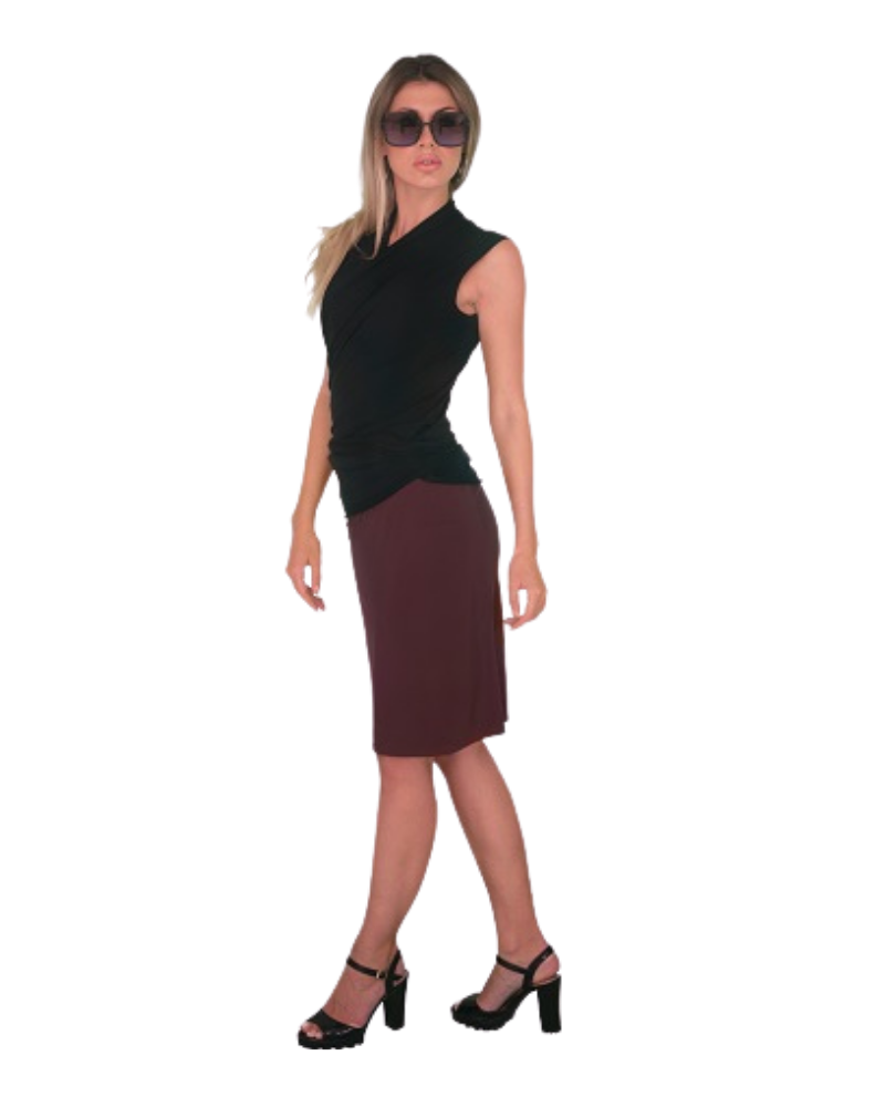 This Chocolate Brown knee length skirt is perfect for work or party! Pair it with our Anna Rainn Cardigan Wrap Top (sleeveless or full sleeves) and you are good to walk into any meeting or boardroom. Pair it with our Signature Faux Wrap Top and set any gathering on fire. Made of "no-ironing required" fabric, it gets you changed and ready to go in seconds.
