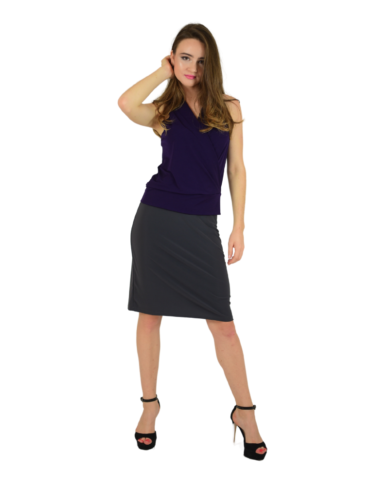 This dark grey knee length skirt is perfect for work or party! Pair it with our Anna Rainn Cardigan Wrap Top (sleeveless or full sleeves) and you are good to walk into any meeting or boardroom. Pair it with our Signature Faux Wrap Top and set any gathering on fire. Made of "no-ironing required" fabric, it gets you changed and ready to go in seconds.