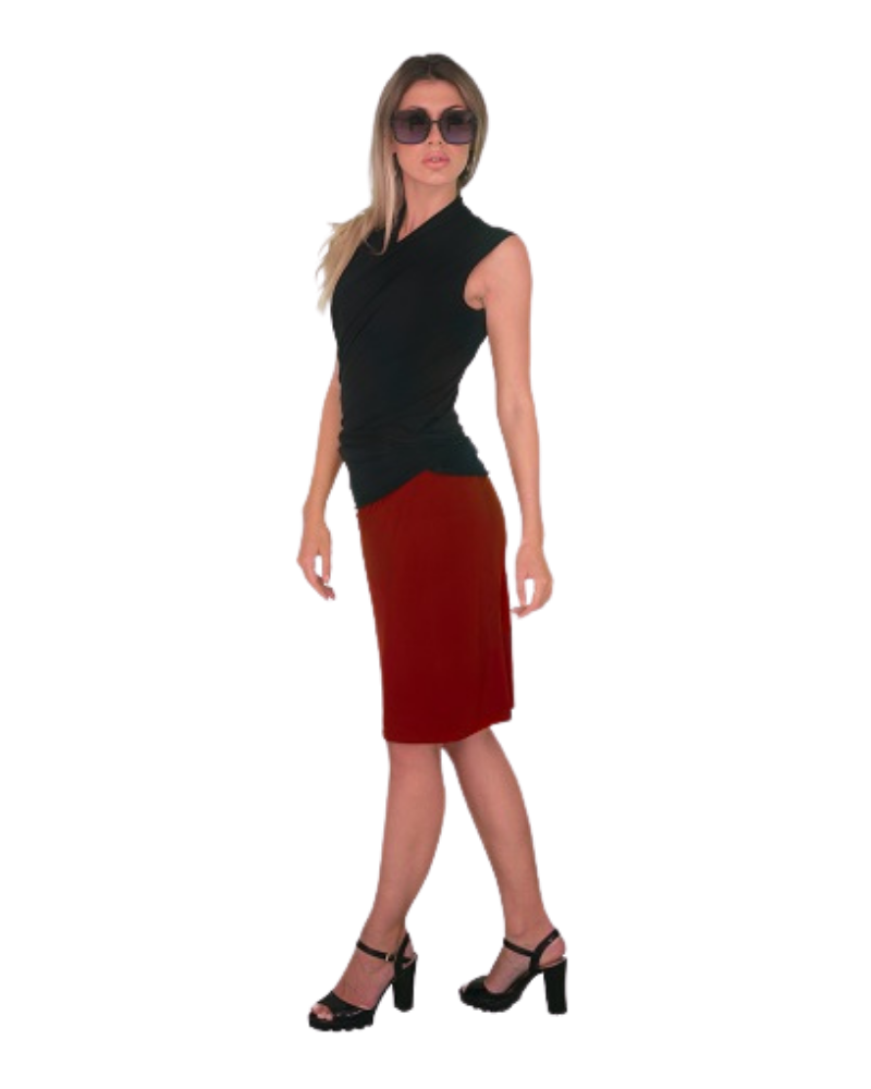This Maroon knee length skirt is perfect for work or party! Pair it with our Anna Rainn Cardigan Wrap Top (sleeveless or full sleeves) and you are good to walk into any meeting or boardroom. Pair it with our Signature Faux Wrap Top and set any gathering on fire. Made of "no-ironing required" fabric, it gets you changed and ready to go in seconds.