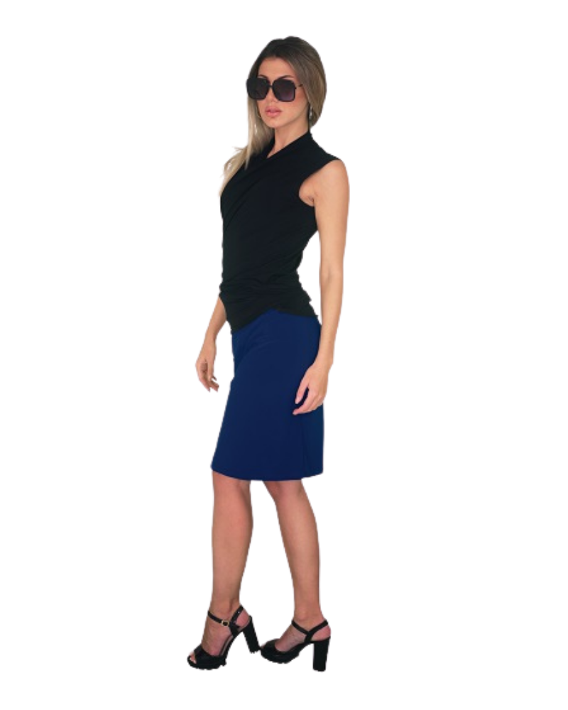 This Navy knee length skirt is perfect for work or party! Pair it with our Anna Rainn Cardigan Wrap Top (sleeveless or full sleeves) and you are good to walk into any meeting or boardroom. Pair it with our Signature Faux Wrap Top and set any gathering on fire. Made of "no-ironing required" fabric, it gets you changed and ready to go in seconds.